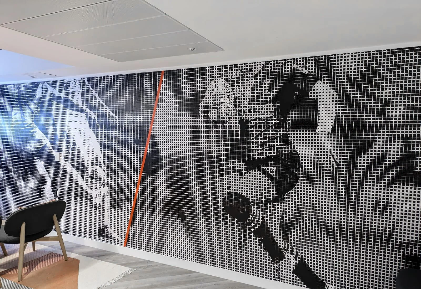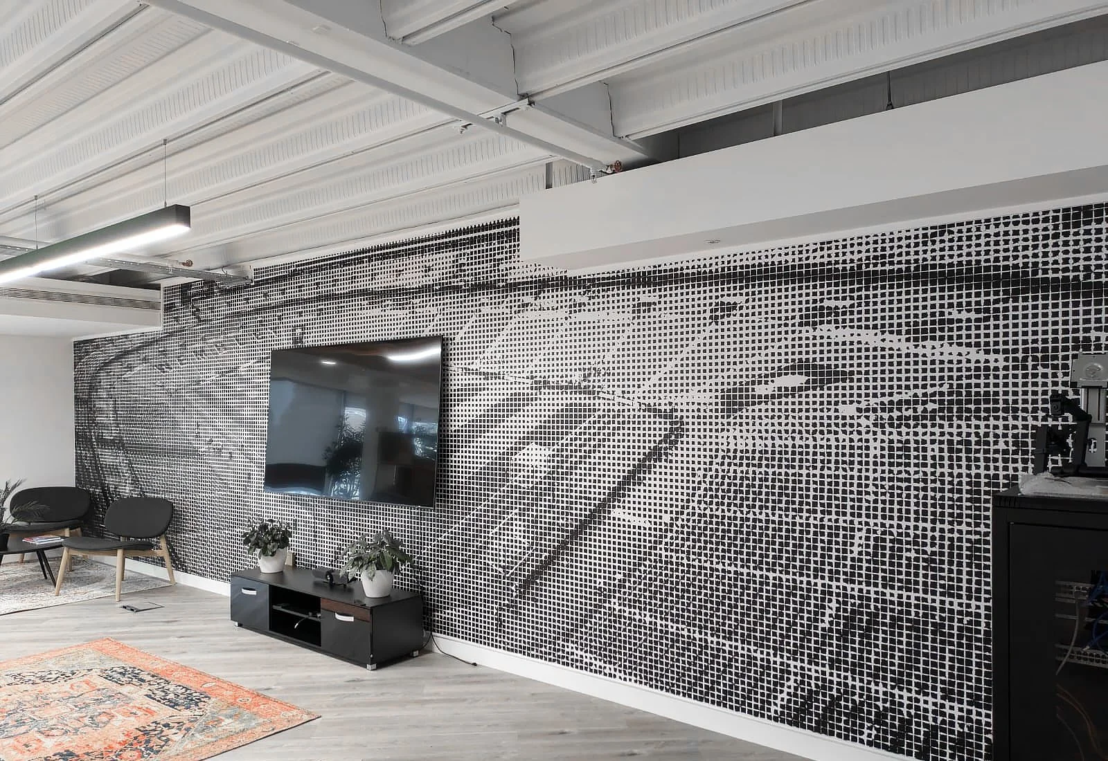 To further enhance the space, a custom monochrome wall wrap was introduced. This feature wall used intricate, high-contrast visuals to highlight key elements of Catapult’s core values and history, bringing the brand’s journey to life within the workspace. The monochrome palette added a sophisticated, tech-inspired aesthetic that aligned perfectly with Catapult’s innovative identity.