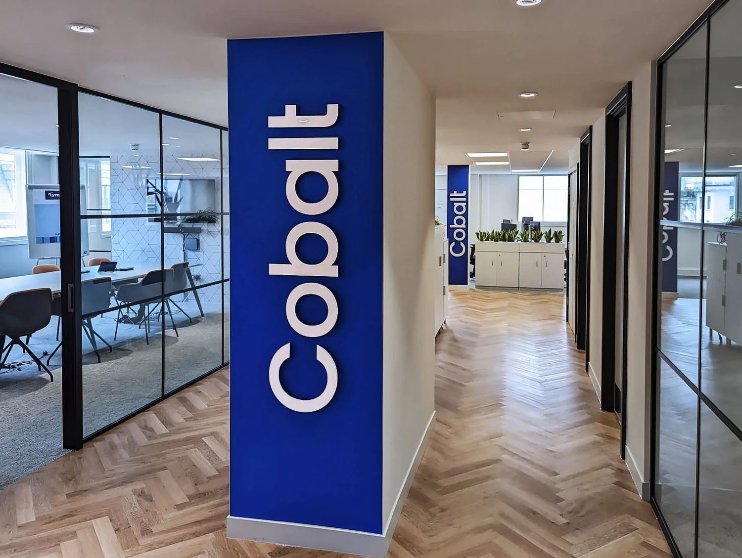 Cobalt Recruitment approached Signs Base with the request of adding a touch of "Cobalt Blue" branding to the interior decor of their new office in Marylebone, London. The main idea behind the project was to keep the artwork minimalistic and simple while adding company colours to the main areas of the office.