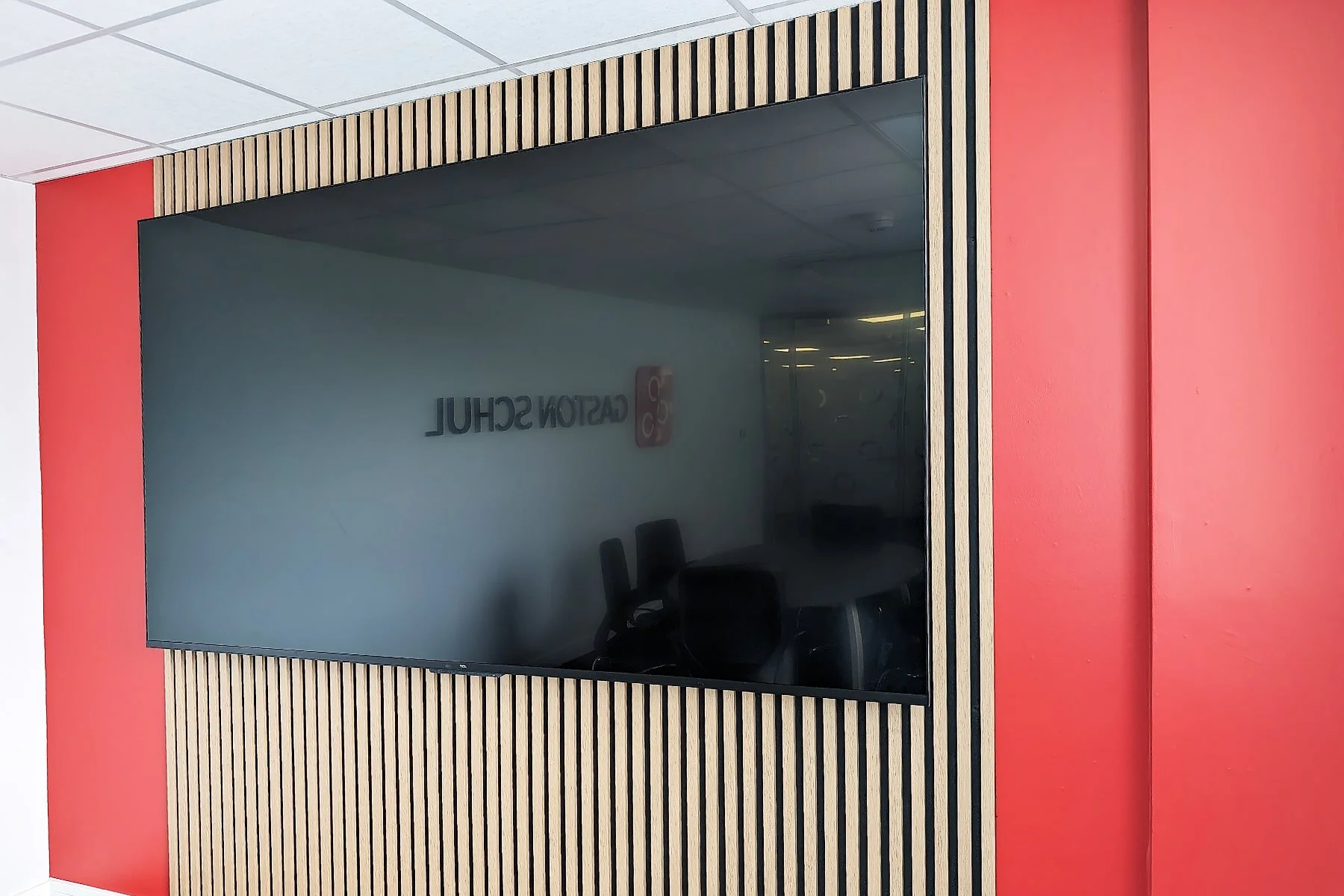 The transformation began with the installation of a Bespoke Foliage Wall featuring face-illuminated built-up letters. This eye-catching feature introduced a touch of nature into the office while prominently displaying the Gaston Schul logo. The illuminated letters added a sophisticated and professional touch, ensuring the brand made a striking impression on both visitors and staff.