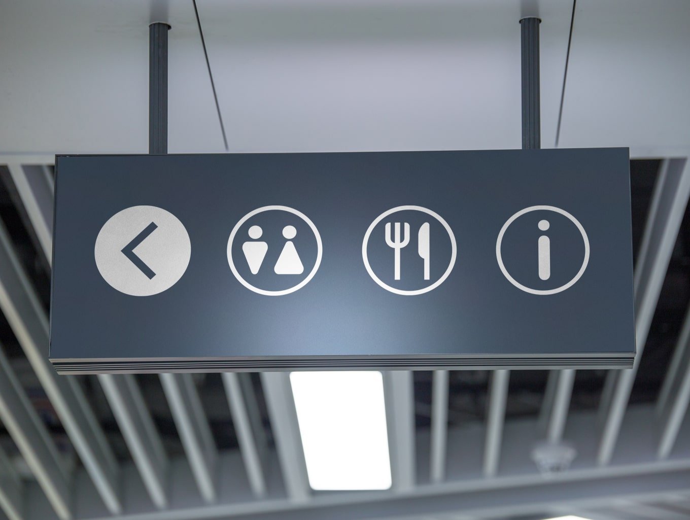 Ceiling mounted signs can be spotted in shopping centres, markets, airports or warehouses. Although the main purpose of suspended signs is to promote sales or provide directions, this versatile product can be also used as a fascia or shop front if manufactured using more durable material such as aluminium. Suspended signs can be also supplied with internal or external illumination with push through lettering or as an emergency exit sign that illuminates when the light is off.