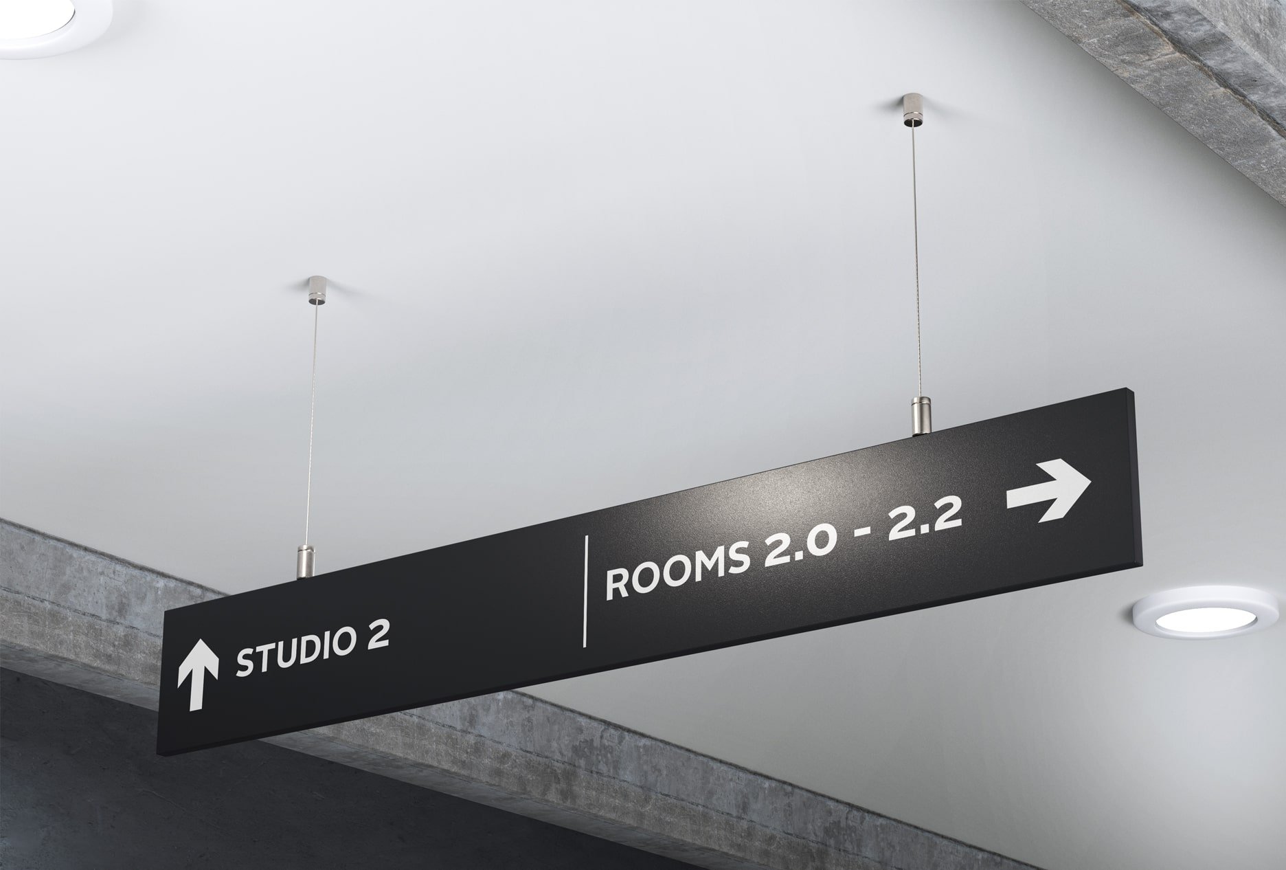 Our ceiling suspended signs are manufactured using lightweight but durable foam PVC, foamcore, or aluminium and mounted to the ceiling with metal brackets or cords.